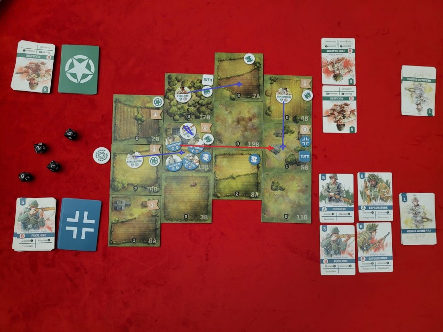 Decido di cambiare tattica e mando il mio esploratore B nei boschi di partenza del tedesco, la tessera 5B, che vale ben 3 PV e mi porterebbe a vincere, dato che nel frattempo ho conquistato anche il controllo, grazie ai fucilieri B, delle tessere 2B e 16B. Federica intuisce cosa sto cercando di fare e sposta il suo esploratore A da La Raye alla sua retroguardia.