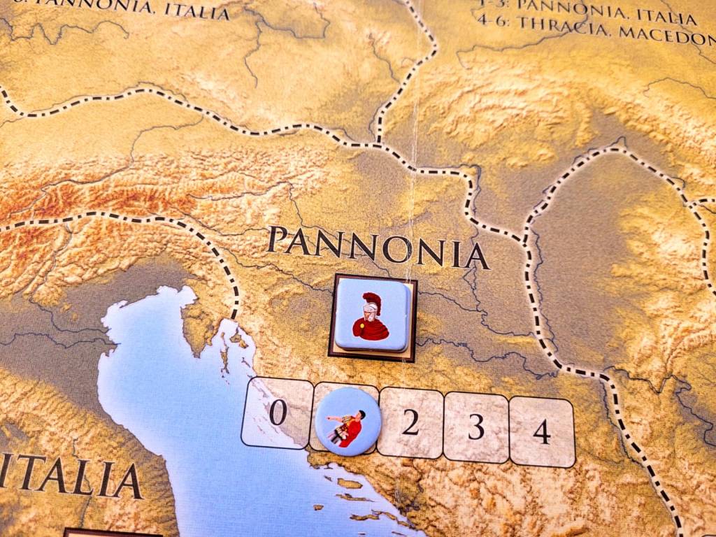 Dopo aver composto la propria mano, partendo dal primo giocatore, tutti svolgeranno il proprio turno, che si sviluppa lungo una serie di fasi uguali per tutti. Per prima cosa il giocatore tira due d6 sulla tabella crisi, per verificare se una delle tribù barbare al confine dell’impero si attiva, poi con un successivo tiro si verifica se quella tribù parte per invadere effettivamente l’impero e che strada segue. Successivamente si prosegue con il cuore del turno del giocatore, la fase Azioni, dove utilizzando le carte selezionate precedentemente, egli potrà spendere i punti influenza e attivare (se presente) l’effetto stampato su di essa. Le azioni sono molteplici e vanno da quelle militari, come reclutare un generale, rafforzare un esercito con nuove legioni, muoverlo e combattere, passando per politiche, che hanno a che fare con i governatori e il controllo politico delle province, per arrivare alle azioni civili, dove si può aumentare la stabilità di una provincia, organizzare dei giochi per sedare eventuali tumulti in città, oppure costruire un’opera pubblica (Anfiteatro, Basilica e Limes, ovviamente con effetti diversi e che danno punti gloria alla fine della partita per chi li controlla). In questa fase del gioco è importante non solo avere una visione strategica di cosa vogliamo fare, ma anche tattica, adattando le nostre mosse sul tabellone a ciò che avranno fatto i nostri avversari. I punti influenza non bastano mai e ci si trova a fare delle scelte dolorose, sacrificando alcune strade per percorrerne altre più importanti nel momento contingente. Questo mix di pianificazione (la scelta delle carte) e adattamento al gioco altrui, vista anche la forte interazione tra i giocatori che il sistema prevede, risulta estremamente dinamico e divertente e non annoia mai, appassionando anche chi non è molto avezzo ai giochi storici o card driven.