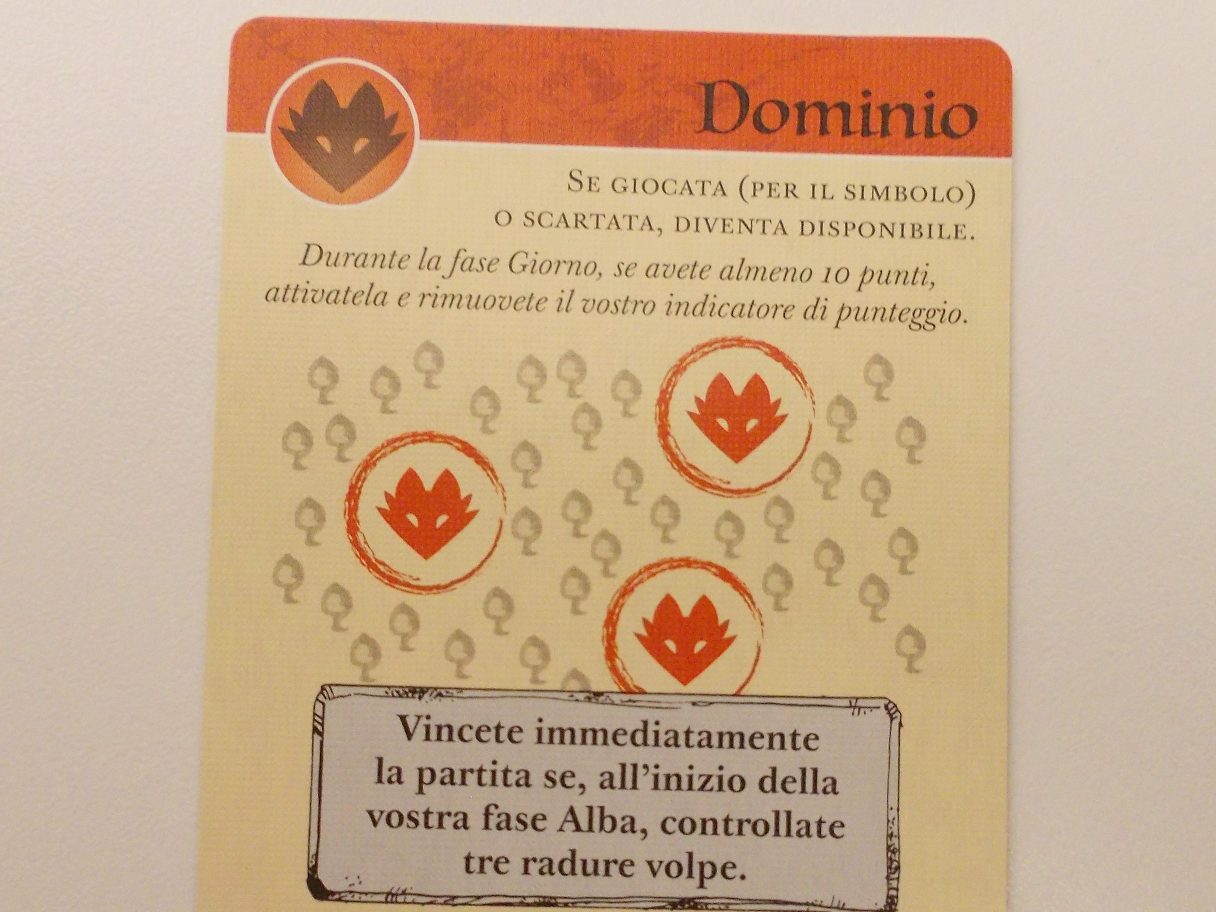Si continua così: tanti scambi di “cortesie” in quella radura, mentre grazie ai tanti posatoi e a qualche oggetto prodotto arrivo a 19 punti, nonostante una seconda insurrezione e la conseguente elezione del despota… ovviamente Gege ignora la produzione, dato che può vincere solo dominando tre radure volpe. Inspiegabilmente continua ad ignorare la radura volpe sud, sotto il mio controllo, finché non tento l’azzardo, per provare a spezzare il fronte su un’altra linea. Decido di attaccare la sua radura topo a sud, poco difesa, per distruggere un centro di reclutamento con cui continua a mandare nella radura volpe centrale gatti freschi a ogni turno. Mi scopro e gli consento di contrattaccare, invadendo la radura volpe a sud… faccio tutti i conti giusti e… sbaglio a contare una pedina nella radura centrale, non fortificando così la mia posizione, sicuro di avere un pareggio in tasca per questo turno: ovviamente la Marchesa si lecca le vibrisse e tace, finché alla sua alba svela il mio errore, vincendo così la partita.