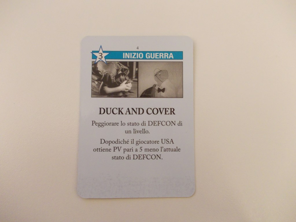 A livello di gioco, questa carta offre ben 3 punti operazionali a chi la gioca, mentre l’evento a favore degli USA la rende particolarmente dolorosa per i sovietici se nel turno in cui viene giocata si è abbassato di molto lo stato di DEFCON. La tempistica con cui essa viene giocata è fondamentale, quindi, ma essendo una carta ripetibile si presenterà molte volte in mano ai giocatori, soprattutto in Inizio Guerra. Se giocata dal giocatore URSS, questi deve fare attenzione a giocarla in un momento del turno in cui ovviamente il DEFCON sia a suo favore, quindi sul 5 se possibile.