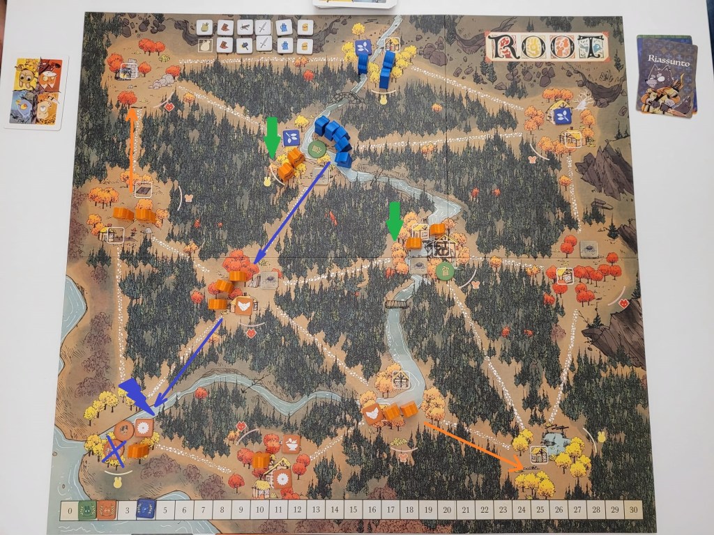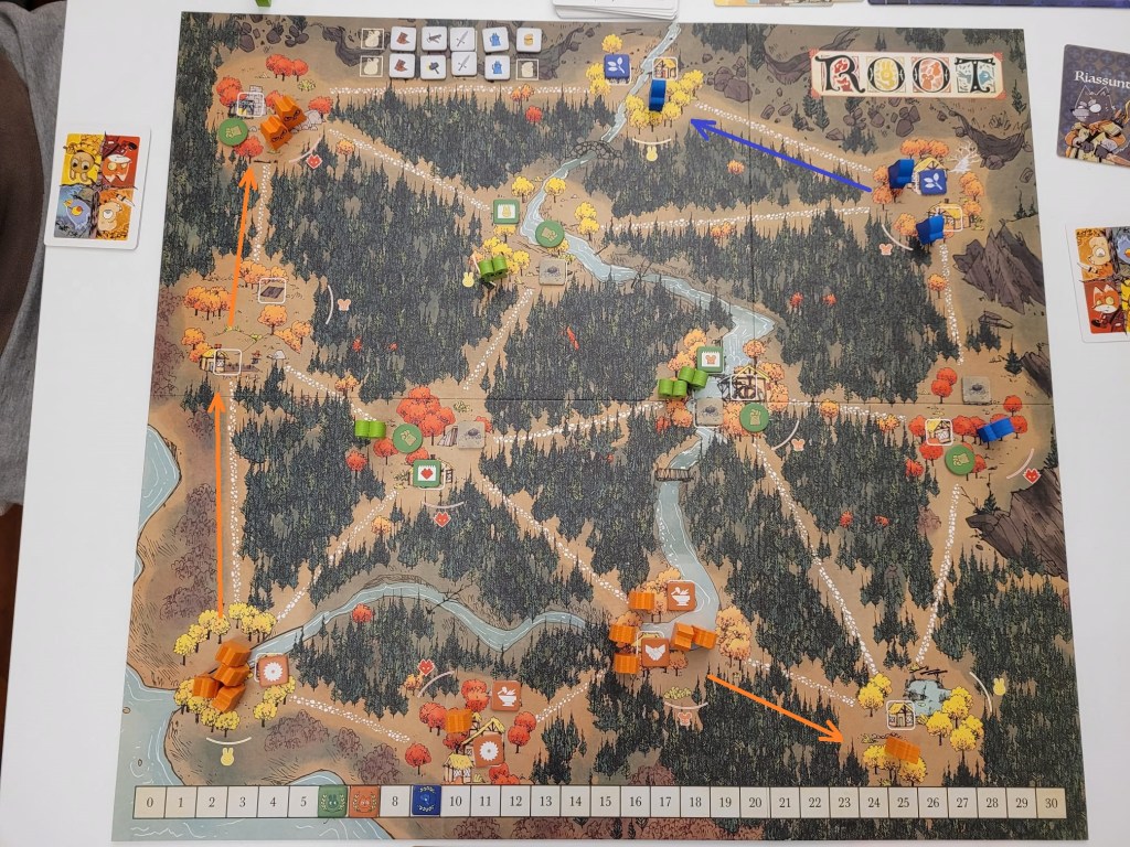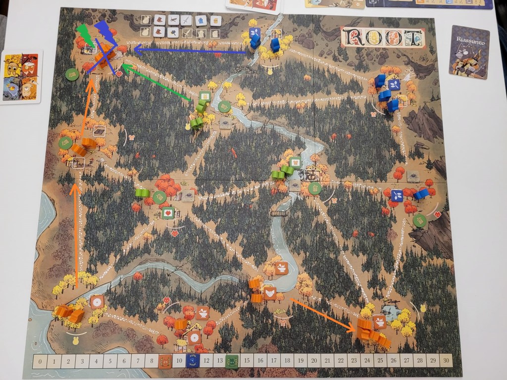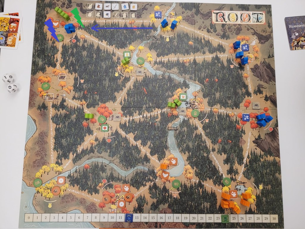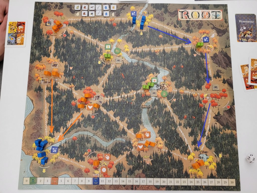 Mia moglie prende la Marchesa de Gattis, Eugenio la Dinastia delle Aquile e io l’Alleanza dei Boschi, che facciamo debuttare per la prima volta in una partita: dopo il setup, il consueto veloce ripasso delle regole e lo studio della nuova fazione, ci buttiamo a capofitto in questa nuova avventura tra i boschi di Root!