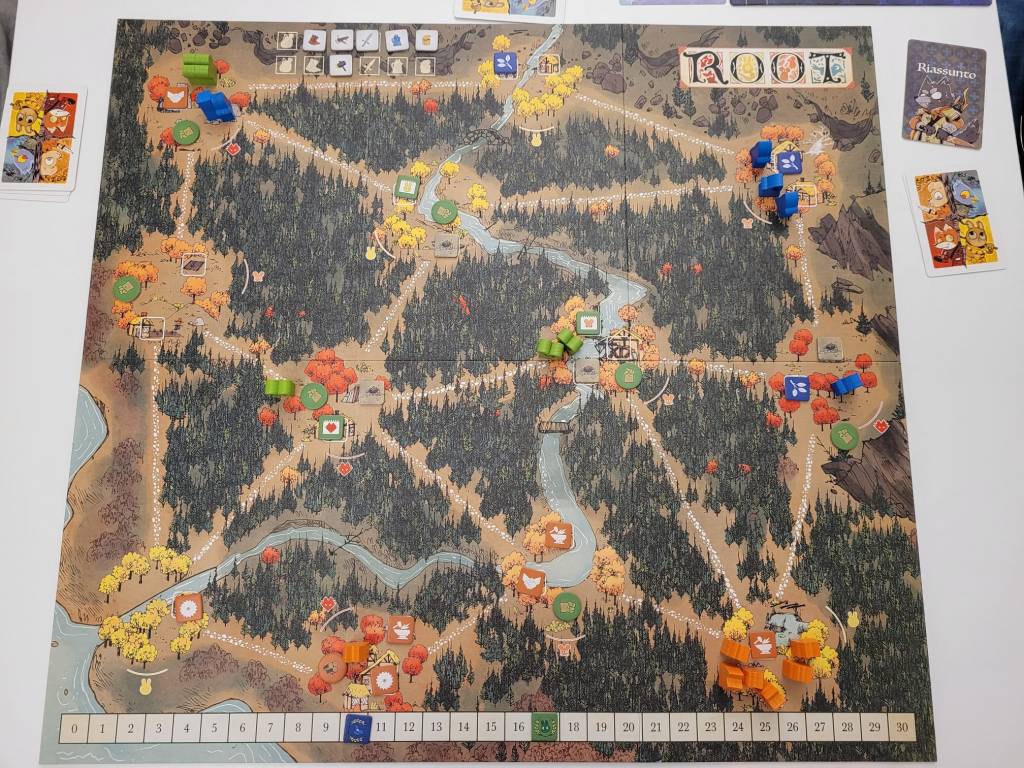 Ieri sera viene a trovarmi Gege per la consueta partita settimanale e dopo una partita veloce a Monster Slaughter, quando finalmente rincasa Federica dal lavoro ne approfittiamo per intavolare una partita a Root. Non lo stiamo giocando spesso quanto vorrei e questa è una buona occasione.