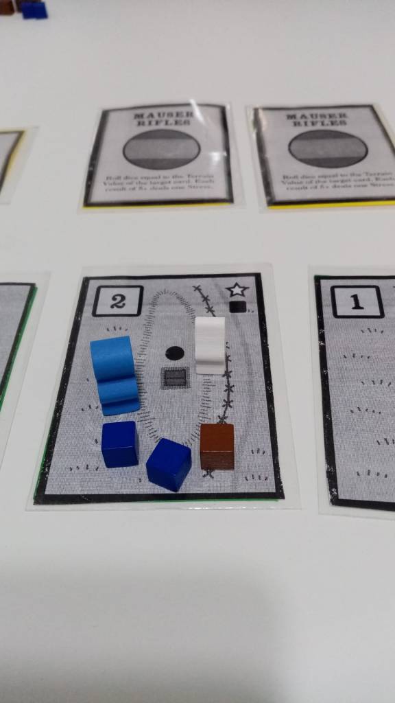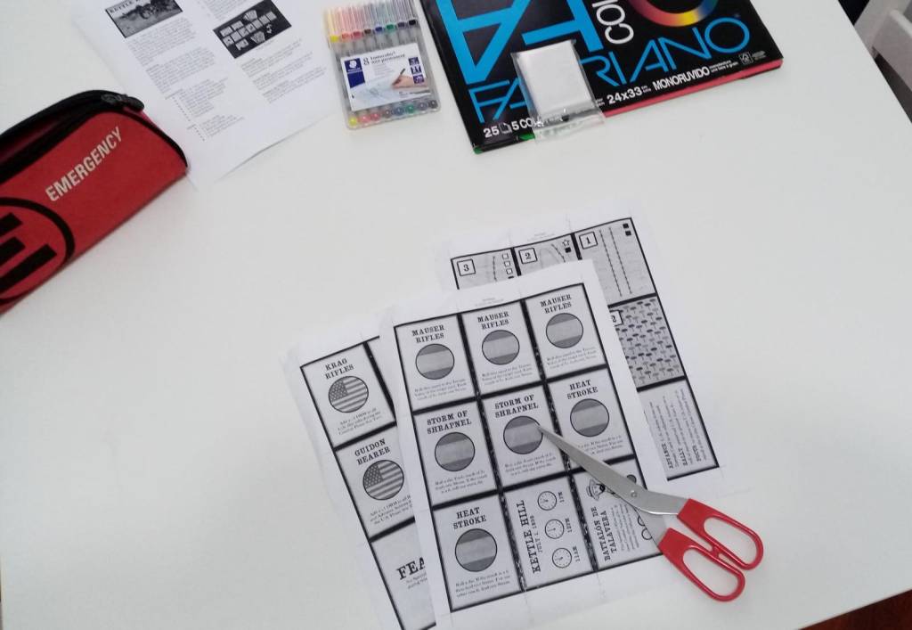 La stampa (in bianco e nero, ahimè, poiché ho usato la stampante dell’ufficio che non ha la cartuccia a colori) si articola di tre pagine di regole su due colonne e di tre pagine di carte, del formato classico. Per far sì che le carte fossero mescolabili e maneggiabili, le ho inserite in bustine protettive e ho spessorato il retro con del cartoncino colorato: verde per le carte terreno, blu per le carte statunitensi, giallo per quelle spagnole. La copertina del gioco, una carta di aiuto per il giocatore e la carta col tracciato dei turni le ho lasciate libere, tanto non vanno maneggiate durante la partita e non rischiano di rovinarsi. Per completare il tutto servono alcuni cubetti colorati (rappresentano le unità militari e segnalini di sevrizio del gioco), possibimente blu, marroni e bianchi per aderire ai codici di colore delle regole, oltre a due meeple, uno blu e uno bianco (rappresentano il nostro personaggio principale); per rappresentare il filo spinato io ho utilizzato dei quadratini di cartone che mi erano avanzati dal defustellamento di qualche gioco che ora non ricordo (mai buttare via niente…): direi che ci siamo, siamo pronti per iniziare!