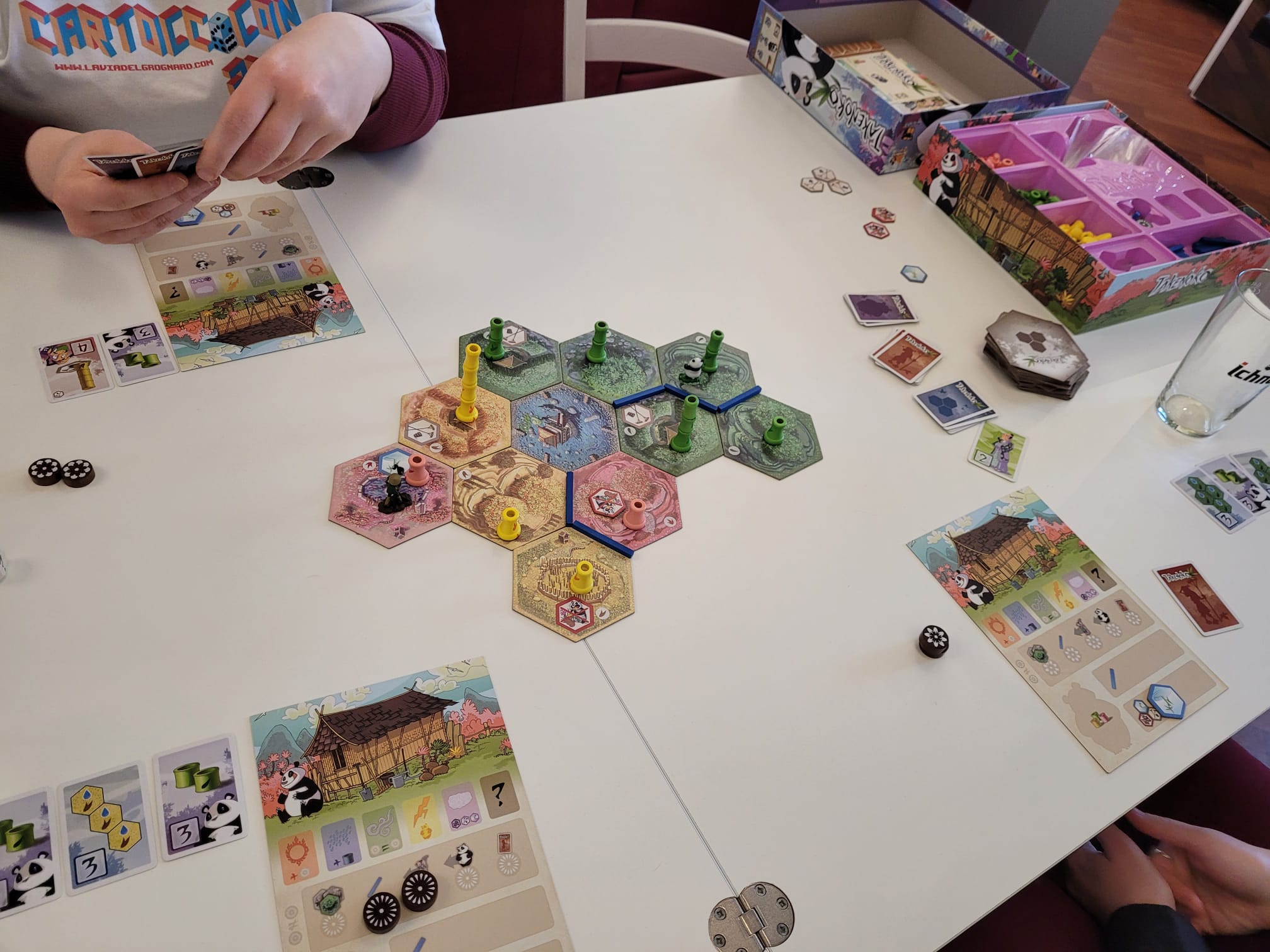 Nel frattempo ci raggiungono finalmente gli Spignello (Federica M. e Tiziano), quindi i tavoli sono al completo e si può entrare nel vivo! Si switchano i tavoli, così i maschi vanno a giocare a Takenoko e le femmine a Colt Express!