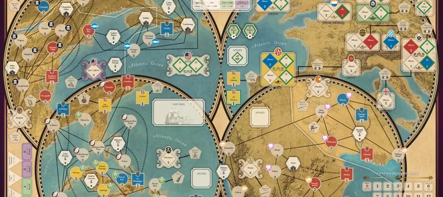Imperial Struggle (GMT Games per l’edizione originale, 2020) narra del conflitto tra Francia e Inghilterra che ha caratterizzato il 18esimo secolo: coprendo oltre 100 anni di storia, il gioco passa attraverso la Guerra di Successione Austriaca, quella dei 7 anni, quella di Successione Spagnola e la Rivoluzione Americana; dipinge le rivalità commerciali che le due superpotenze affrontarono nel mar dei Caraibi, in India e in Nord America; racconta delle battaglie diplomatiche nelle corti europee, di trattati, di personaggi come John Law, James Cook o Madame de Pompadour; di istituzioni come la Compagnia delle Indie Orientali o la corte del Re Sole; del commercio di tabacco, pellicce, spezie, cotone, pesce e canna da zucchero, di flotte dislocate in mari lontani e vicini e conquiste di roccaforti che dominano le regioni… insomma, come avrete capito, Imperial Struggle racconta una marea di cose, e lo fa dannatamente bene.