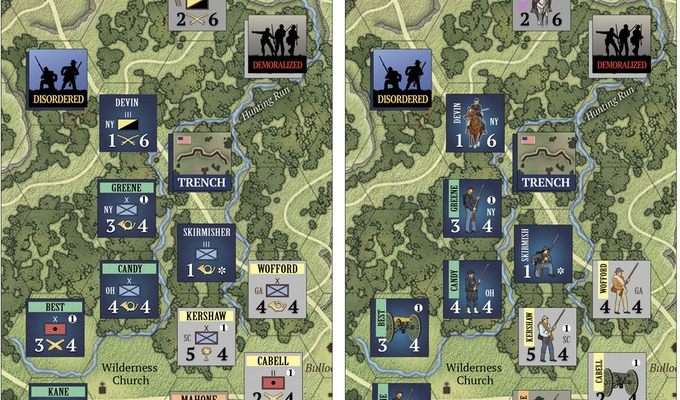 Sergio cura personalmente la grafica dei suoi giochi, in particolare le mappe, che da buon cartografo di professione sono sempre molto studiate e storicamente attendibili: “dal punto di vista grafico credo di aver fatto un discreto lavoro, la mappa mi ha portato via un bel po’ di tempo: ho dovuto scaricare le mappe dei landowners della Virginia del 1863 per capire davvero l’estensione dei boschi e delle foreste… mi sono divertito!“.