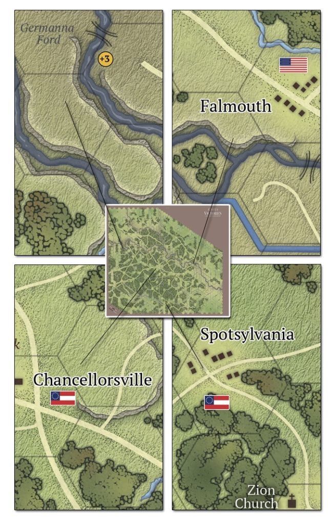 “Fu una delle campagne più complicate della Guerra Civile Americana“, ci spiega Sergio; “nell’aprile del 1863 l’Armata del Potomac, Unione, al cui comando è stato appena messo Hooker, si divide in due tronconi, ognuno dei quali è singolarmente più numeroso del’intera Armata della Virginia Settentrionale (Lee). I due gruppi passano i fiumi che li separano dal nemico e si inoltrano in territorio sudista. Da qui parte il gioco, con l’aggiramento già compiuto”.
