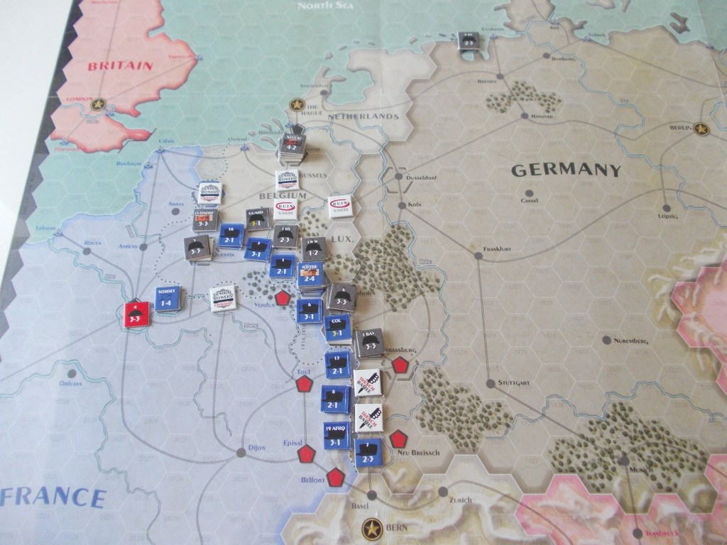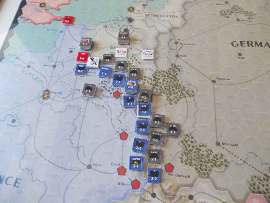 I francesi decidono dunque di assaltare le montagna a sud-est di Nancy, dove i tedeschi hanno solo il corpo ERSATZ GER lì trincerato, grazie alle forze del 21° FR, 14° FR e 13° FR. Grazie alla rapida dislocazione del 21 RS GER di stanza a Strassburg in prima linea, le forze di difesa della montagna vengono pesantemente rinforzate. I francesi così perdono il 21° FR e il 14° FR e salvano il 13° FR soltanto spendendo un preziosissimo Resource Point (RP) e subendo un punto di demoralization, mentre i tedeschi perdono solo l’ERSATZ GER, le truppe sostitutive dal pochissimo valore.