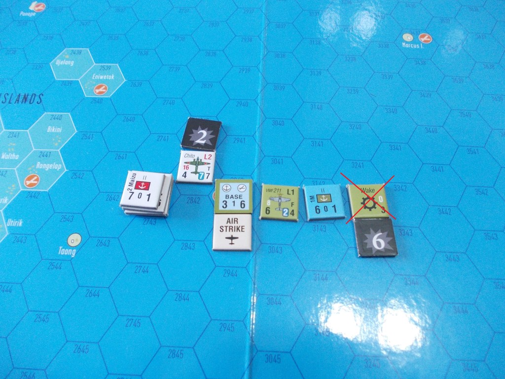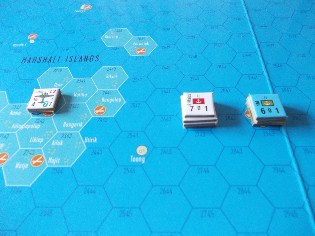 A questo punto le navi della Task Force entrano nell’esagono dell’atollo (ricordiamo che in Pacific War un esagono ha 100 miglia di lato), dando la possibilità ai sottomarini americani dislocati lì di effettuare un singolo attacco, che però viene vanificato da un pessimo, pessimo tiro di dado. A questo punto quindi i giapponesi inviano la forza da sbarco!