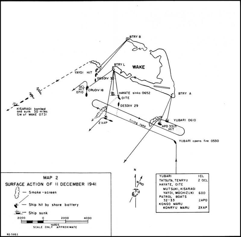 Dopo pesanti bombardamenti da parte dei micidiali Mitsubishi G3M decollati dalla base di Kwajalein, nelle isole Marshall, che distrussero gran parte della guarnigione aerea, l’11 dicembre i giapponesi tentarono l’invio di una forza d’assalto per sbarcare sull’isola e prenderne il controllo. I 450 soldati della Kaigun Tokubetsu Rikusentai, il corrispettivo nipponico dei Marine americani, tentarono invano di formare una testa di ponte sulle spiagge del lato sud dell’atollo, con obiettivo principale l’aeroporto, ma furono respinti dal contingente statunitense e costretti a ritirarsi.