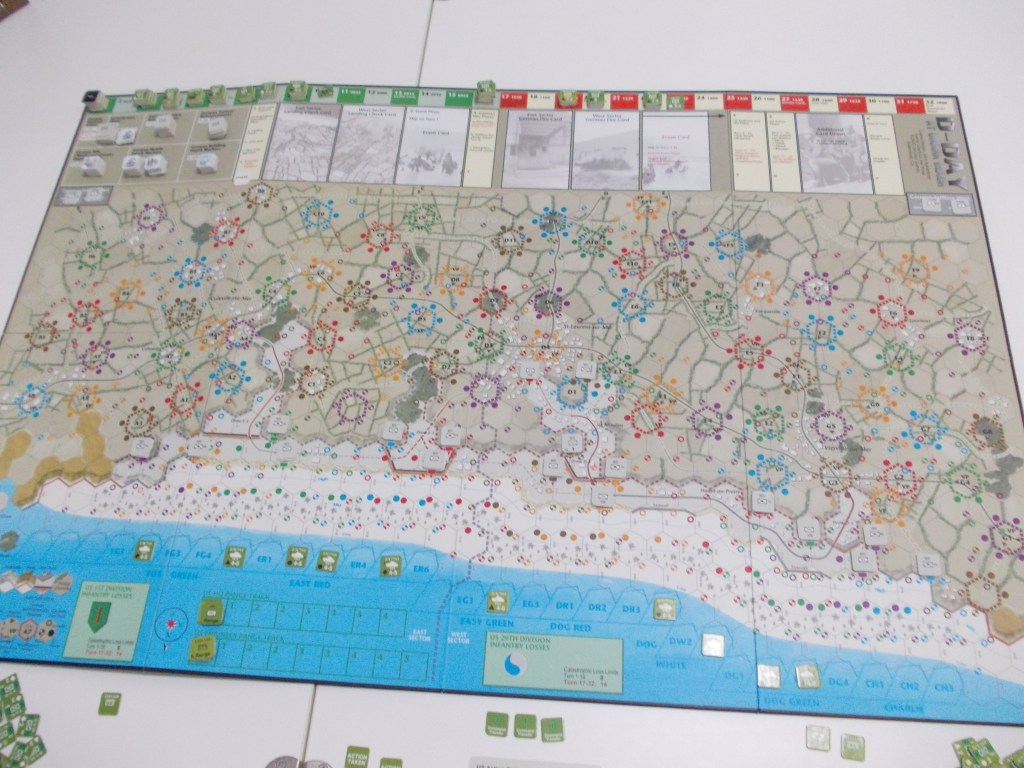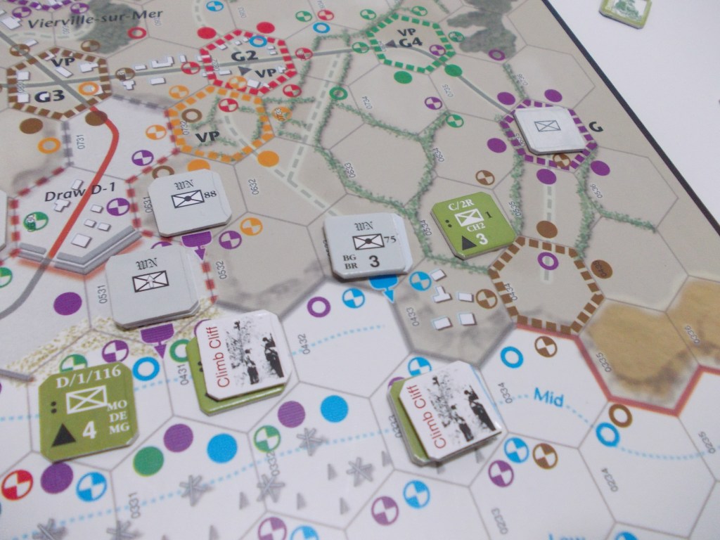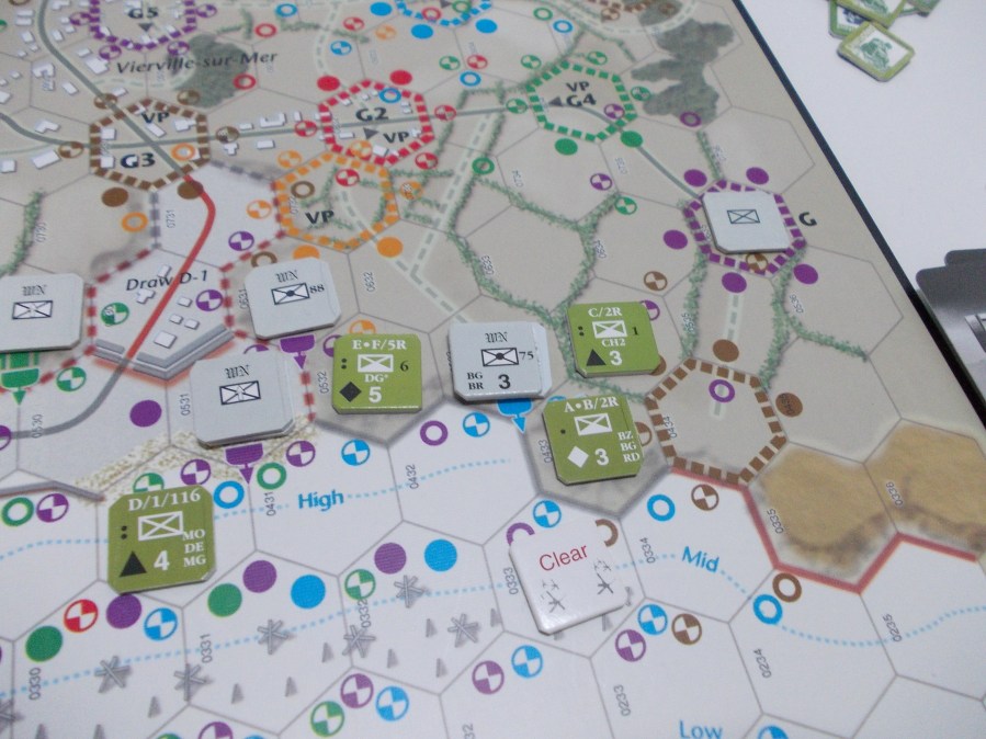 Per il conteggio dei punti si calcola 1 PV per ogni WN controllato (i WN doppi contano due punti ma solo se si controllano entrambi gli esagoni), più un punto per ogni postazione tedesca rinforzata (incluse quelle non marcate con VP) e 5 punti per ogni draw; per il controllo delle uscite dalla spiaggia bisogna considerare che nessun esagono che le compone deve essere sotto controllo nemico ne sotto tiro di una postazione nemica, per cui a questo fine considererò solo come conquistata la draw D-1, mentre la E-1 non è stata ripulita del tutto, purtroppo: c’è ancora una postazione fortificata che la minaccia con le sue terribili MG-42!