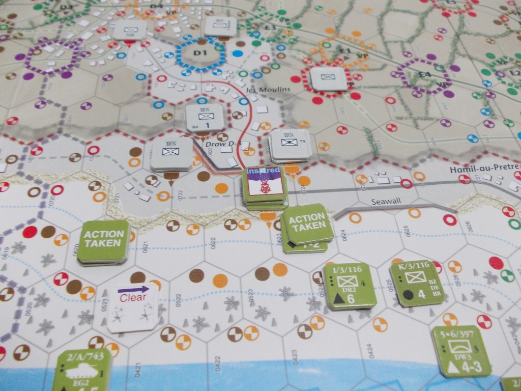Alle ore 07:45 arriva la media marea, la Mid Tide. Questo significa che ora è possibile che le mine che i genieri non sono riusciti a sminare mentre c’era bassa marea possono esplodere, uccidendo i soldati e distruggendo carri e artiglieria. Inoltre, tutte le unità rimaste al di là della linea di mid tide alla fine del turno saranno eliminate. Questo rappresenta un problema non di poco conto, dato che per ogni turno di gioco abbiamo a disposizioni due azioni per il settore est della 1° divisione e due azioni per il settore ovest della 29°. Tirare via dalla marea le compagnie di fanteria non rappresenta un grande problema, grazie alla regola della Preservation Move (per cui un’unità di fanteria ha a disposizione un movimento gratuito finché è sulla spiaggia per portarsi a ridosso dell’acciottolato e tirarsi via dal bagnasciuga e dal tiro delle MG-42). Ma i carri e la fanteria pagheranno un prezzo molto alto, la maggior parte andrà distrutta non riuscendo a tirarsi via dalle sabbie mobili e dai cavalli di frisia.