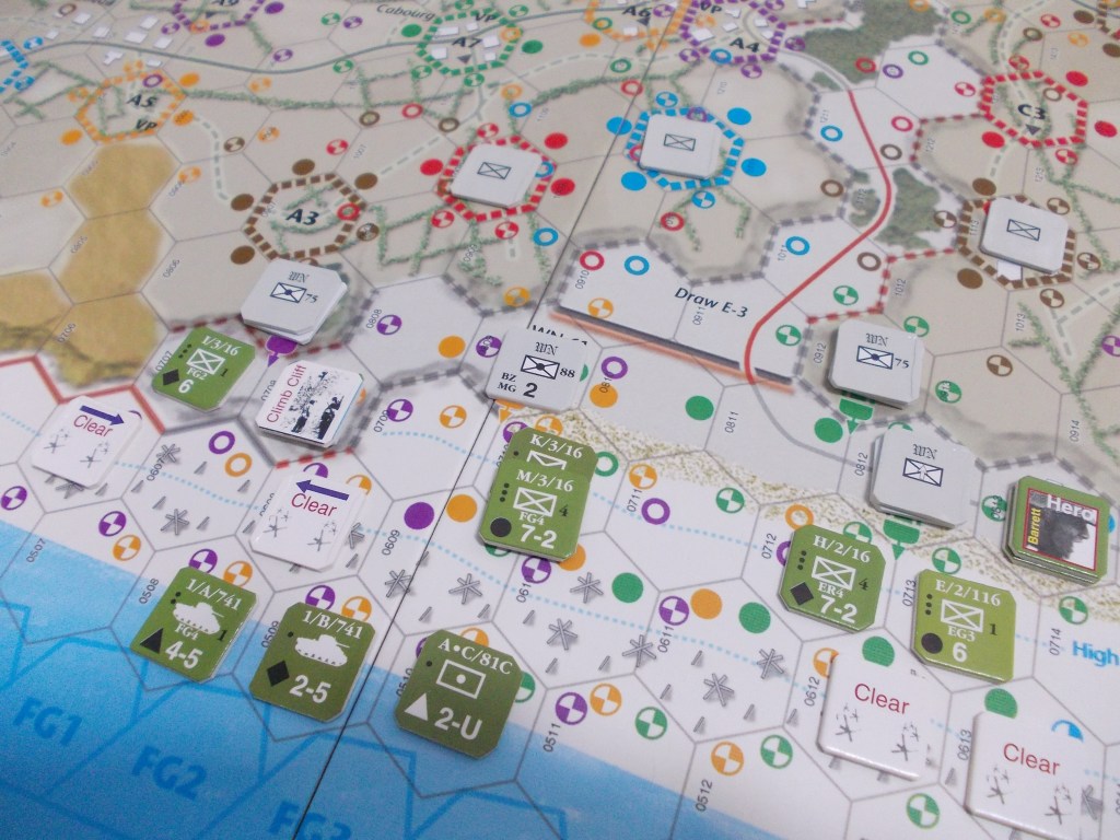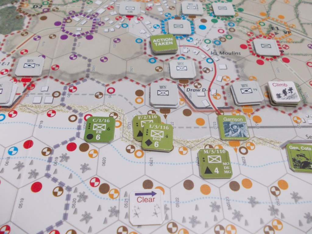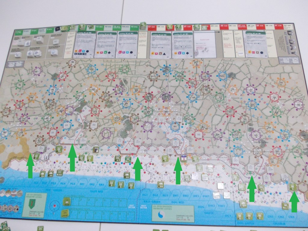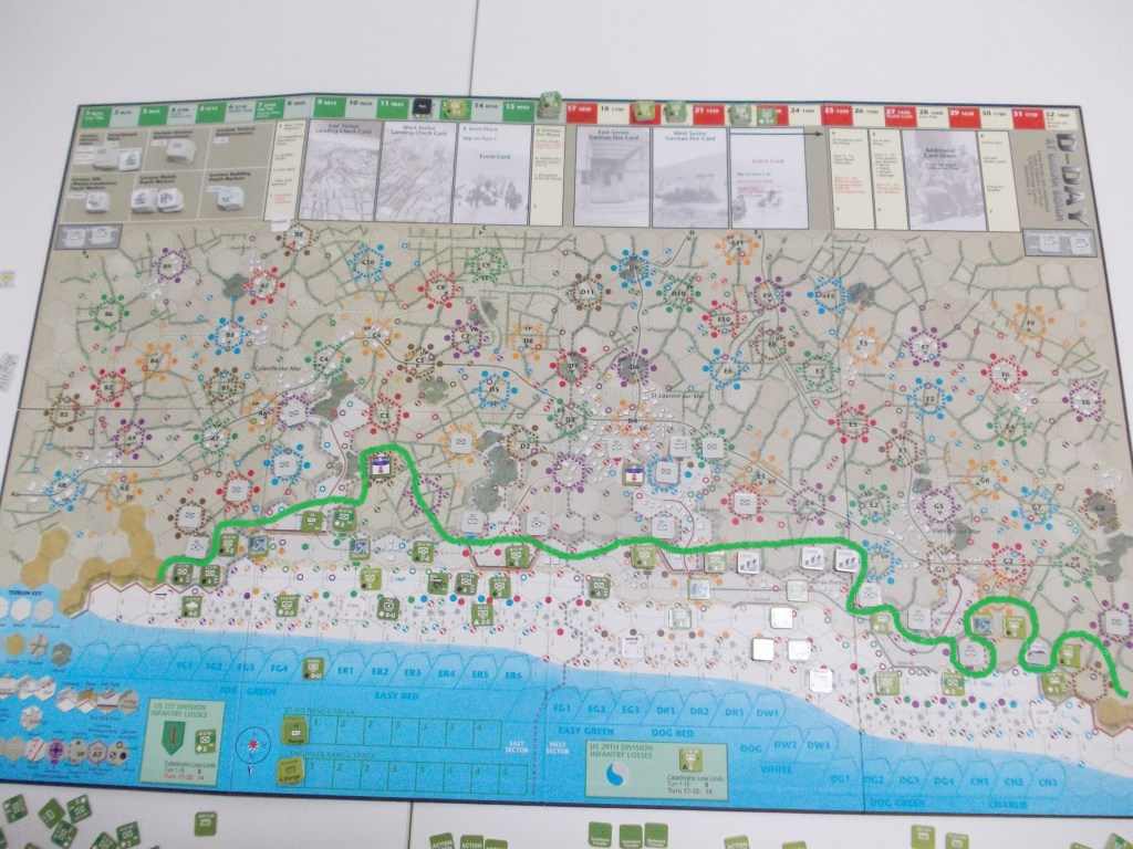 Alla fine dell’ultimo turno dello scenario First Wave, cioè il 16° (h 10:00), i combattimenti infuriano su tutta la linea della spiaggia. La draw E-1 di fronte al settore Easy Red, di competenza della 1° divisione, è ormai conquistata, così come, verso ovest, la draw D-1 nel settore Dog Green della 29°; i ranger hanno ormai avuto ragione delle postazioni tedesche lungo le scogliere occidentali della spiaggia e si dirigono a grandi passi verso Vierville-sur-Mer.