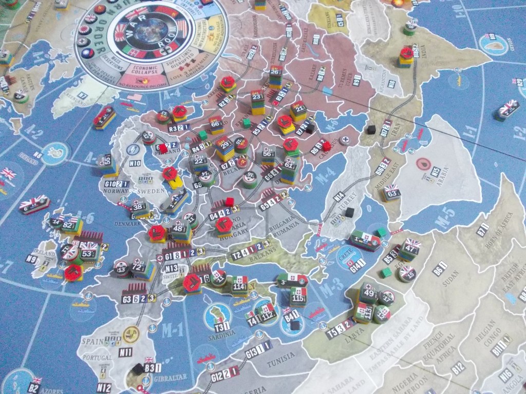 Ad un certo punto mi sono trovato con una brutta situazione da gestire con i britannici: il fronte africano stava, dopo i primi successi iniziali, andando malissimo: l’Asse mi aveva quasi del tutto annientato le forze in Egitto e anche se in Sud Africa gli inglesi hanno qualche possibilità di creare forze (massimo 3 a turno), c’è la questione logistica di portarle al nord, questione non di poco conto dato che con un singolo ordine si può muovere, sfruttando la ferrovia ancora integra, dal Sud Africa all’Africa Orientale Britannica, ma da lì c’è ancora in mezzo il Sudan per poter portare rinforzi in Egitto: ciò si traduce in un turno per la produzione, un turno per il movimento in ferrovia, un turno per il movimento da AOB a Sudan e ancora un turno da Sudan a Egitto. QUATTRO TURNI. E in War Room quattro turni sono un sacco di tempo, tempo nel quale possono succedere molte cose, tra cui perdere l’Egitto, come è successo. Direte voi, e perché non sfruttare l’India e le sue industrie, e poi la ferrovia che da lì conduce fino in Medio Oriente e da lì in un solo altro turno in Egitto (totale 3 turni contando la produzione)? Verissimo, purtroppo nel frattempo l’India era minacciata dai maledetti giapponesi, che spingevano con continui attacchi dalla Birmania e non potevo lasciarla troppo sguarnita. Perdere l’India per i britannici significa essere buttati fuori dal Pacifico (rimane l’Australia, vero, ma a livello continentale l’India è fondamentale per gli inglesi per poter dare man forte a cinesi e russi nello strappare le conquiste nipponiche). Quid faciam? Il risultato è stato la perdita dell’Egitto (maledetto Rommel!), l’indebolimento dell’India che per lungo tempo è stata assediata dai giapponesi e un dirottamento delle risorse dei britannici verso le industrie africane e indiane, ritardando la preparazione per l’invasione dell’Europa, tutto a favore dei tedeschi e a discapito dei sovietici, che del Secondo Fronte avrebbero giovato assai (e invece adesso si trovano le truppe di Paulus a solleticare Mosca).