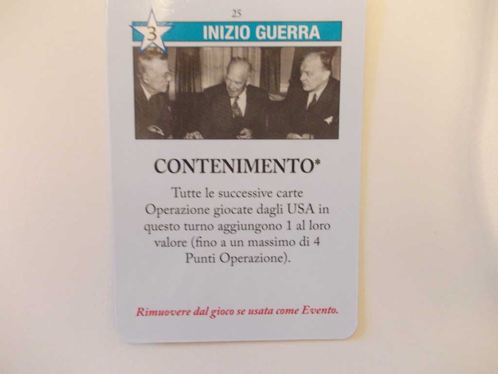 Come USA, questa carta se possibile va usata come carta di Apertura, per massimizzarne gli effetti. Se pescate una mano particolarmente sfavorevole in termini di punti operazionali, avete due strade: o usarla come apertura per migliorare un po’ le vostre possibilità nel turno, oppure conservarla per il turno successivo dove, si spera, avrete un monte punti operazionale maggiore, massimizzando ancora di più i suoi effetti. Tenete conto che in Inizio Guerra gli USA si espandono lentamente, ma con questa carta giocata in apertura o inizio turno potete avere una marcia in più.