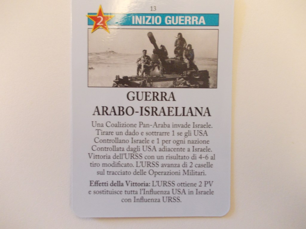 Come USA, per arginare l’effetto di questa carta basta piazzare una influenza nei tre stati sopracitati (Giordania/Libano/Egitto) e tutto andrà bene. Se anche la si gioca come PO, in una situazione del genere ci si ritrova con 2 punti operazionali e scarse possibilità di successo per il sovietico.