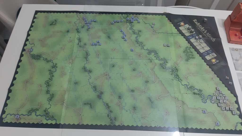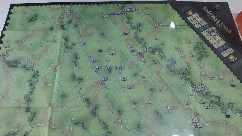 Non ho aspettato molto ad intavolarlo perché già da una prima lettura del manuale, scorrevole e ben scritto, pieno di esempi e con delle interessantissime note storiche, strategiche e militari finali a cura di Alessandro Barbero, Marco Scandigli, Paolo Cirri e Jean-Claude Brunner, il mio hype era altissimo. All’interno della scatola sono presenti alcuni scenari più piccoli, adatti ad introdurre le meccaniche di gioco… ma chi mi segue sa quanto mi piacciano i gioconi lunghi, le campagne che durano giorni, per cui mi sono cimentato subito in una partita completa. A differenza di altri wargame operazionali, questo Radetzky’s March consente di entrare nel cuore del gioco fin da subito poiché l’impianto di regole è ben strutturato, snello e veloce da interiorizzare. Per una recensione completa del gioco vi rimando a quella scritta dal SigFapos, caporedattore della sezione wargame di Giochi sul Nostro Tavolo.