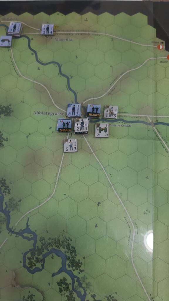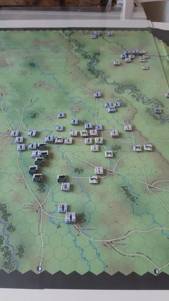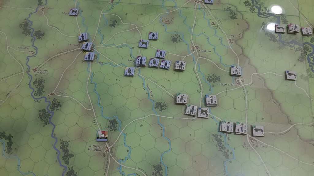 Mentre continuano i turni mi accorgo di aver forse sbagliato a concentrare troppe forze all’assalto di Vigevano passando per il Ticino. Avrei dovuto forse passare dai guadi di Pavia con quasi tutto l’esercito, lasciando perdere Abbiategrasso (anche se da Piemontese questo mi avrebbe facilitato il compito di provare a marciare su Pavia… ma togliendo forze necessarie alla difesa della parte centrale -e importantissima- della mappa!) e provare a prendere Mortara il prima possibile: questo avrebbe obbligato il Piemontese a distribuire diversamente le sue forze, disperdendole di più.